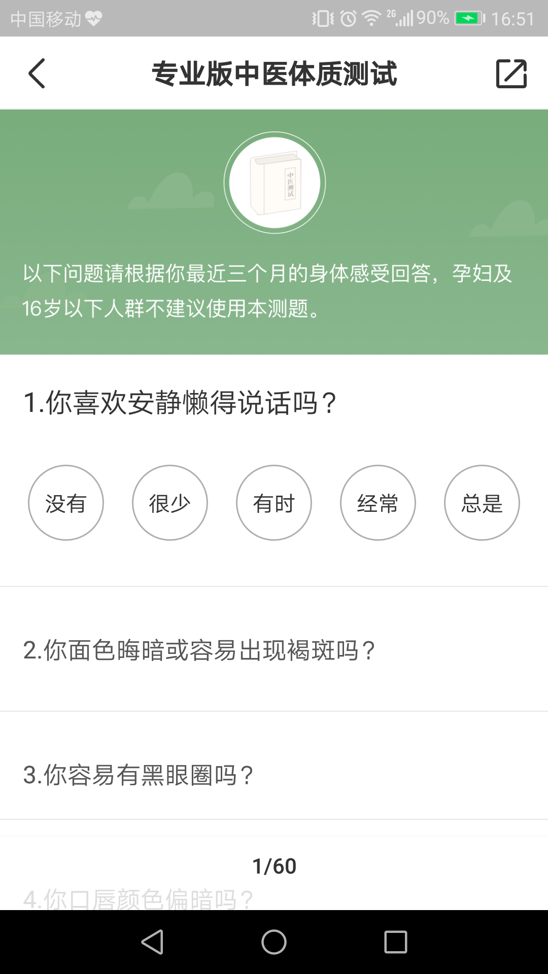 “过日子”里面,我最常用的是体质测试这一功能,根据你近3个月的感受,做60道题测试你目前的体质,告诉你造成的原因以及解决办法。