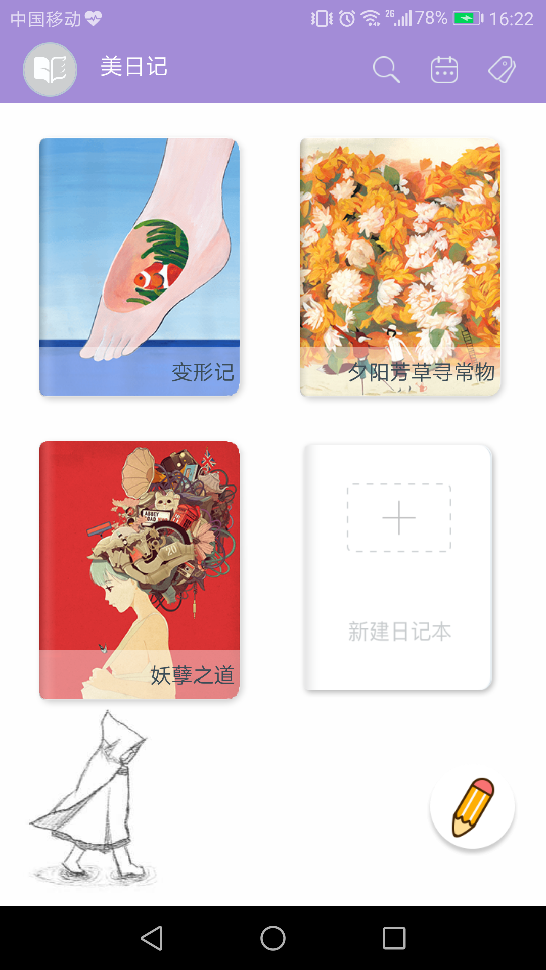 我觉得,作为写日记的APP,界面友好,基本功能有就OK了,千万别把功能整得花里胡哨,否则会舍本逐末,最后没多久就不想写了。“美日记”首页是你可以根据自己需求新建多本日记本,按分类给他们命名,选择封面图,系统给的图片就很好看,点击进入日记本之后,新建笔记。