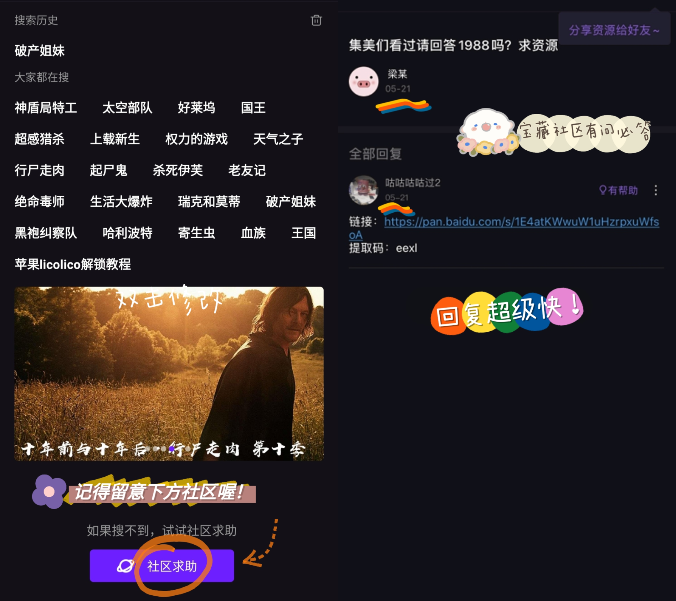 而且最令人感到贴心的是,如果你找的美剧比较偏门,在软件里找不到资源……没关系!上次发现在软件搜索下方有个社区求助,发帖向各位社区老铁们求助,乐于助人的他们会超快回复你!