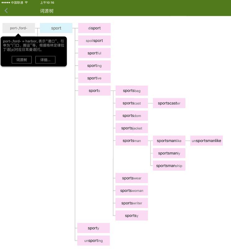 APP给每个单词做了词根分解,给单词画“词源树”,有了这棵树你就可以了解这个单词的来龙去脉了。比如查询sport,你可以看到: